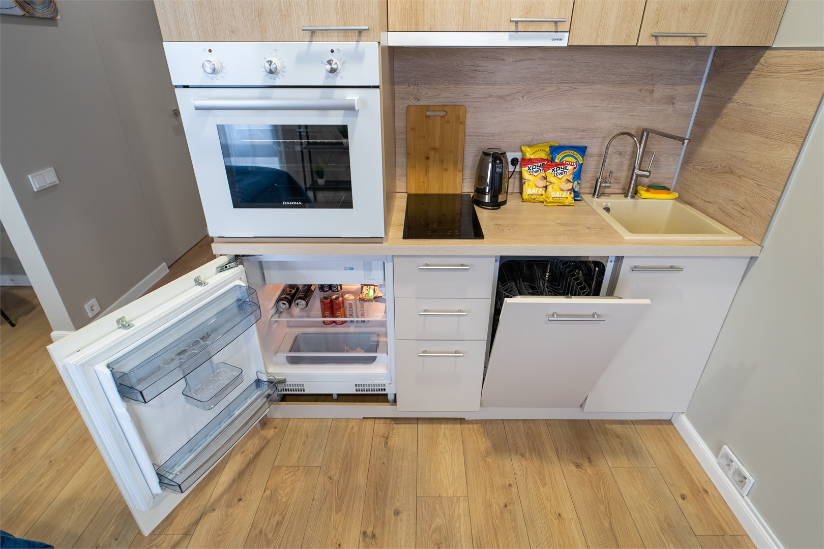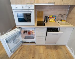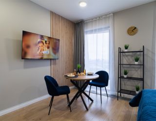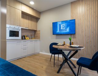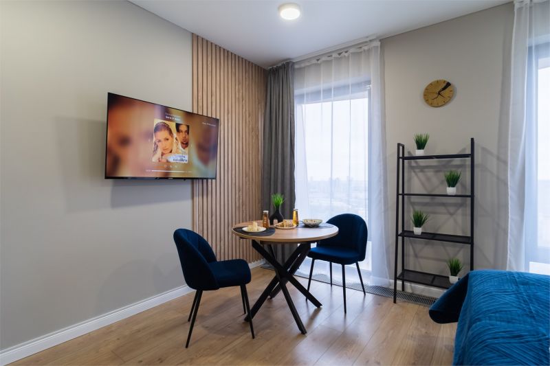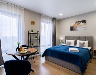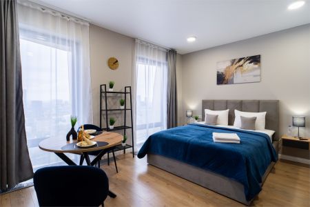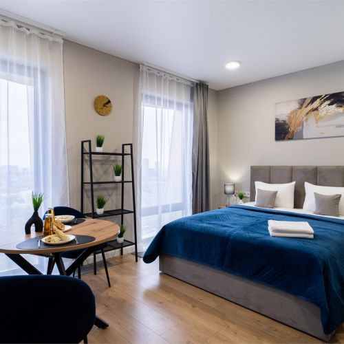 Элегантная, со вкусом оформленная дизайнерская студия подходит для размещения двоих гостей. Установлена большая удобная кровать, обустроено компактное рабочее пространство. В кухонной зоне предусмотрено все, что необходимо для приготовления блюд, имеются посудомоечная машина и обеденная группа. Из панорамных окон в пол открывается живописный вид на город. Совмещенный санузел укомплектован ванной и стиральной машиной. Работает Wi-Fi. Возможно заселение с четвероногим другом.